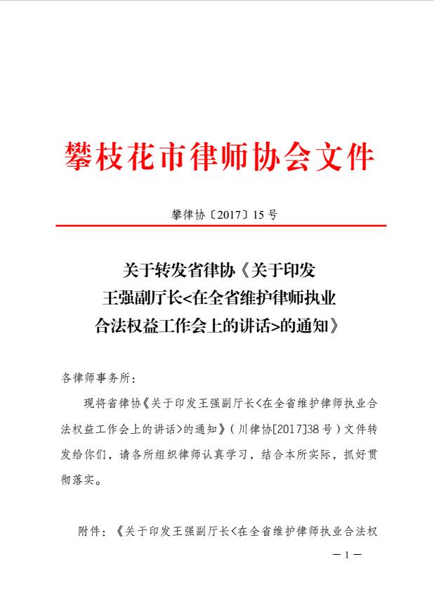 关于转发省律协《关于印发王强副厅长<在全省维护律师执业合法权益工作会的讲话>的通知》
